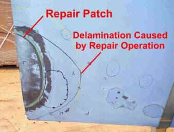 F/A-18 trailing edge flap following repair showing additional moisture-induced delamination during the repair operation.