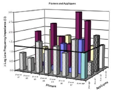 Difference in low-frequency impedance caused by a cyclic accelerated test for a series of primers and appliqués. Averages for each primer and for each appliqué are given on the right and front, respectively.