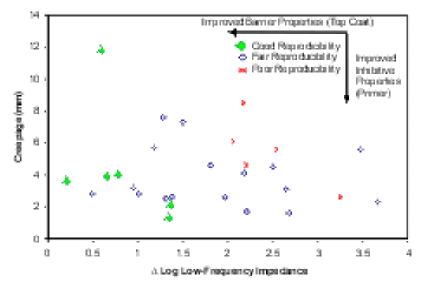 Creepage from a scribe as a function of the difference in log low-frequency impedance caused by a cyclic accelerated test for several top coat/primer systems. The best coatings would be near the origin. Also shown is a measure of the reproducibility from run-to-run and specimen-to-specimen. The best performing coatings have the best reproducibility.