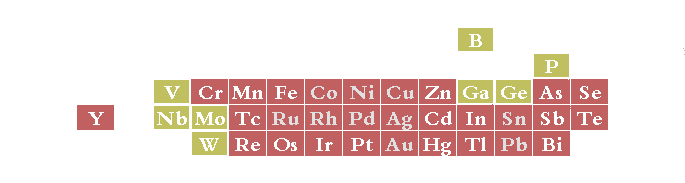 Metals plateable from aqueous solutions (red background). Elements with yellow background are only plateable in combination with one of the others (alloy plating). Grey text indicates that the element can be deposited both by an auto-catalytic electroless process or by electroplating. (reference 81)